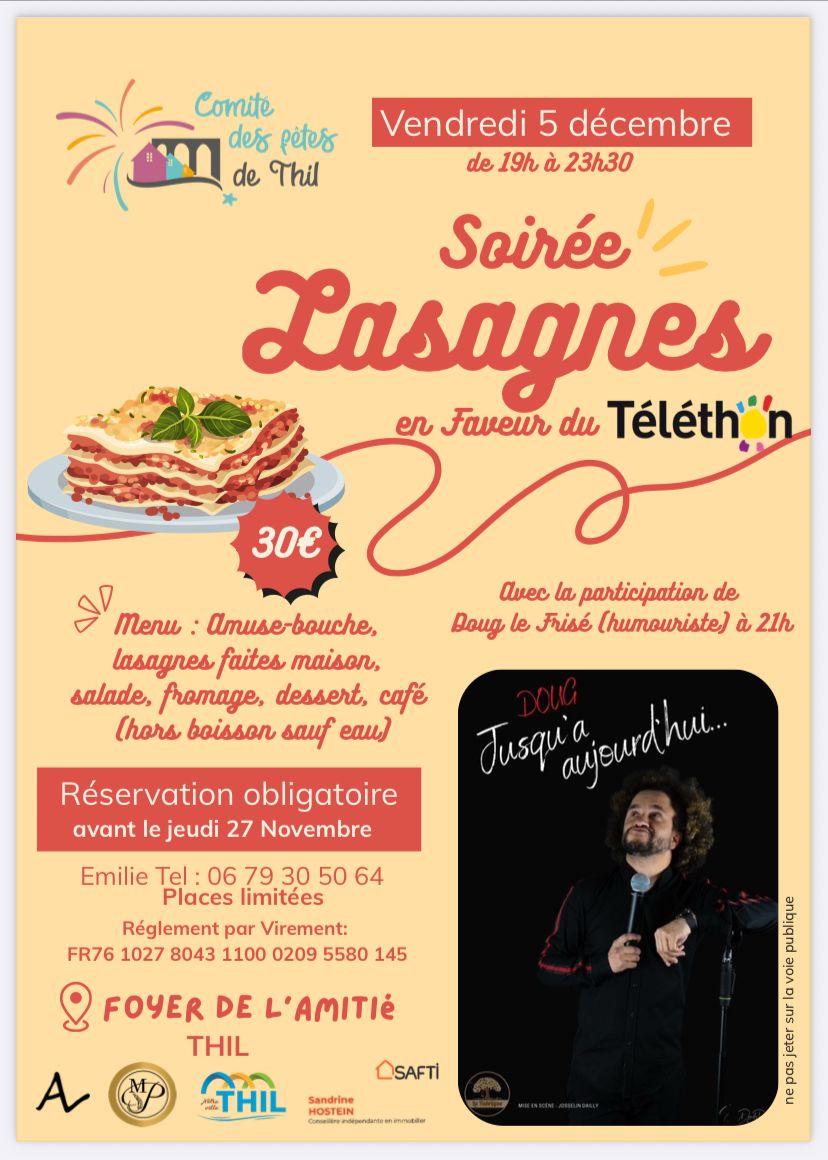 #Téléthon #Thil #ComitéDesFêtes #Solidarité #SoiréeLasagnes #DougLeFrisé #FoyerDeLAmitié #BonneAmbiance